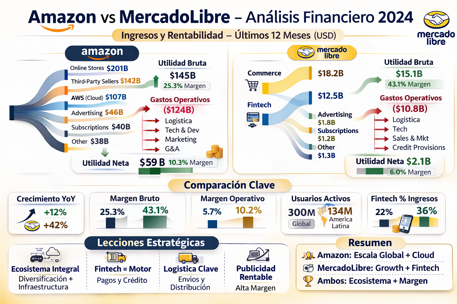 Amazon ha operado históricamente con márgenes ajustados en retail, compensando con AWS y publicidad. MercadoLibre mantiene márgenes saludables considerando que opera en mercados emergentes.